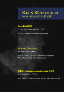 El 16 de abril, en la Konzertsaal 3, la sala grande de la ZHdK, tendremos un concierto de saxofón y electrónica en el que tocaré Zahir III de Simone Movio y Gemma Galeano tocará Signos Oscilantes de Germán Toro Pérez entre otras obras por definir.