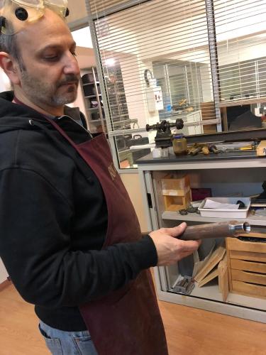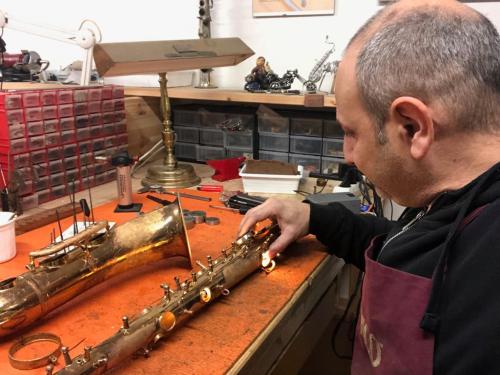 Diego: No tengo claro ya que es raro, nos gusta mucho crear, experimentar e implementar nuevas ideas para los instrumentos, pero quizás algo llamativo que recuerdo fue una colaboración que hice con unos ingenieros, aunque no es directamente algo referido al saxofón pero tenía que ver. Ellos necesitaban incorporar sonidos emitidos por lengüetas tipo saxofón en carteles publicitarios, estos carteles se movían gracias al impulso generado por un compresor de aire, en fin resumiendo había que reutilizar el chorro de aire para generar sonidos afinados que luego serían controlados por ordenador y así generar melodías, un proyecto que creo no llego a buen término por falta de fondos. Quizás debería decir que fui de los primeros en adaptar mecanismos o realizar modificaciones para hacer más fácil la ejecución tanto a músicos amateurs con discapacidades físicas o músicos con manos pequeñas y a veces aunque a disgusto y con cierta desconformidad, recibo encargos para modificar saxofones vintage y transformar su mecanismo para hacerlo moderno. Hacer estos trabajos de modificaciones en saxofones modernos no me duele tanto, además sé que hay muchas marcas que aún pueden aprender más sobre la fisonomía de las manos y hago mi pequeño aporte en este sentido, pero modificar saxos antiguos me duele en el alma, como restaurador y colaborador con el museo de la música es algo que me crea un poco de rechazo, pero bueno el trabajo es trabajo.
