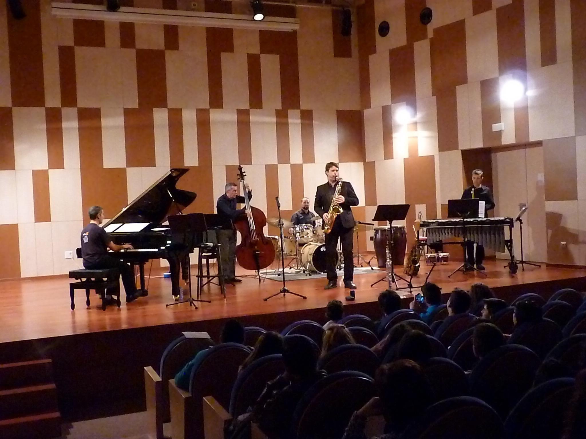 Jose Carlos: A partir del año 2001, una vez establecido en el Conservatorio de Elda, vi claro que iba a ser mi destino definitivo. Como saxofonista había trabajado la mayor parte del repertorio clásico y bastantes piezas del repertorio contemporáneo. El trabajo en un conservatorio profesional en mi opinión es bastante diferente al de un conservatorio superior. Nos encargamos de forjar una buena base técnica en todos los aspectos y el repertorio que manejamos está bastante definido, aunque siempre se pueden aportar novedades, claro. El jazz y la improvisación siempre me habían atraído pero no encontraba el momento para dedicarle el tiempo necesario. Entonces se me plantearon dos caminos: Seguir adquiriendo repertorio contemporáneo cuya aplicación en un conservatorio profesional es mas limitado que en un superior, o dedicar el tiempo disponible a aprender improvisación. Evidentemente escogí lo segundo. En el año 2002 presenté el proyecto de la asignatura optativa Orquesta de Jazz y al ser aprobado por la Conselleria empezamos el curso 2003/2004. Aunque ya tenía nociones de improvisación me vi en la necesidad de adquirir conocimientos más sólidos. Por aquella época había buena disposición de las autoridades locales hacia la cultura y el ayuntamiento de Petrer nos apoyó varios años en la organización de cursos de jazz. Por aquí pasaron Latino Blanco, Toni Belenguer, incluso Perico Sambeat. Organizábamos clases que siempre culminaban en un concierto. Posteriormente estudié armonia funcional con el guitarrista Raúl Ramírez durante tres años. Fui el promotor de dos agrupaciones de jazz con exalumnos y músicos de la zona. Primero la Comboiatzz Band y posteriormente el grupo Urban Life, con el que grabé el disco EL MOMENT. Fueron años muy fructíferos para mi, porque siempre me había desarrollado como intérprete y de repente empezé a componer. Fue rarísimo porque era una faceta que se manifestó bastante tarde.