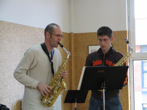 Sin embargo, lo que más valoro hoy en día son las relaciones personales que allí se establecieron. Quizá por ser la primera generación de la LOGSE que empezaba las enseñanzas superiores se creó un ambiente muy especial entre nosotros. Hay que destacar el cambio que suponía este sistema con el anterior Plan 66 en cuanto a programa de estudios. Entre las horas de clase y las de las cabinas de estudio, podríamos decir que fuimos los primeros alumnos que empezamos a vivir en el conservatorio, lo que conlleva muchas horas de convivencia a todos los niveles. También supuso que la mayoría de nosotros nos hubiéramos mudado a Madrid y fuéramos casi vecinos en la zona que rodeaba Atocha. Nos juntamos en aquella época un maravilloso grupo de saxofonistas: Pablo de Coupaud, quien ya era mi compañero en Gijón y lo seguiría siendo después en Montpellier, Sergio Díaz-Ropero, Daniel Durán, David Rubio, Israel Bajo, Mauricio Gómez, Victor Mansilla, Miguel Ángel Lorente, David y Alex Pons, David Sánchez… Pero también grandes músicos de otras especialidades con los que pude aprender mucho y disfrutar aún más, y que hicieron de aquella una época muy bonita que recuerdo con mucho cariño y muchas veces con nostalgia.